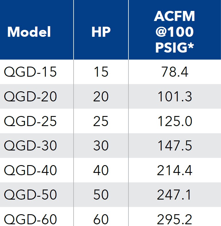 ¿Necesita un compresor de aire que sea resistente, fácil de usar y eficiente? La serie QGD aparece en nuestra línea de compresores de tornillo rotativo de clase mundial, y puede cumplir con todos estos requisitos y mucho más. Estos compresores de aire de 40-60 HP proporcionan mucha potencia: tienen flujo líder en la industria y energía específica disponible a 100-125-150 PSIG. Tiene la capacidad de conectar en red hasta seis máquinas, lo que hace que el QGD sea ideal para sus grandes tareas de aire comprimido.