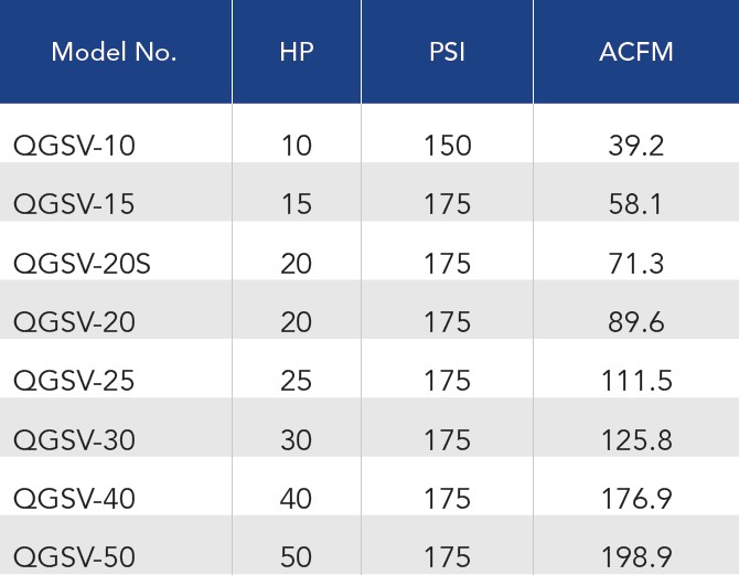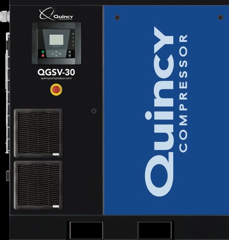 La serie Quincy QGDV es un paquete de compresor de tornillo rotativo de velocidad variable de alto rendimiento que se puede utilizar en una amplia gama de aplicaciones. Todas las unidades QGSV de 10 caballos de fuerza a 50 caballos de fuerza cuentan con una alta eficiencia y gran facilidad de servicio lo que los convierte en líderes de la industria. Los modelos se pueden configurar como unidades básicas o se pueden equipar con algunas opciones básicas para adaptarse mejor a su aplicación. Todos los compresores modelo QGSV tienen bajos niveles de ruido, tamaño reducido y el menor costo total de propiedad en la industria.