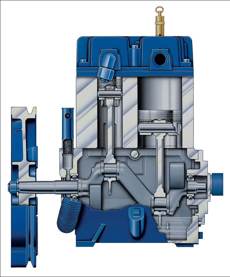 16.- El volante tipo ventilador balanceado electrónicamente, brinda un poderoso flujo de aire a través del interenfriador, el cilindro y las tapas para lograr una efectiva refrigeración y un funcionamiento sin problemas.